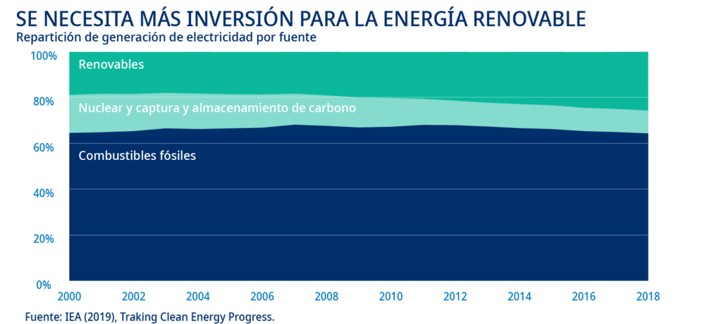 La generación de electricidad es el mayor contribuyente a las emisiones de gases de efecto invernadero, y muchos países siguen dependiendo todavía de los combustibles fósiles, especialmente del carbón, para producir electricidad. Todavía se siguen planificando y construyendo nuevas fábricas de carbón. Las emisiones procedentes de la electricidad aumentaron un 2,5 % en 2018 después de haberse estabilizado en los seis años anteriores, a pesar de las mejoras en la eficiencia energética y de una mayor implantación de las energías renovables. Las políticas que promueven el desarrollo de la electricidad limpia son fundamentales.